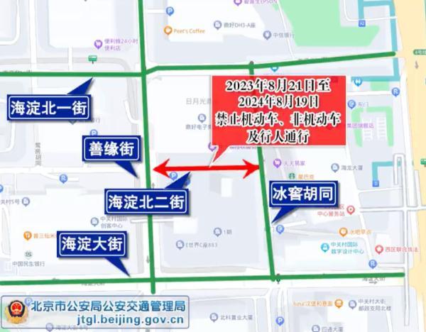 為保證鼎好電子大廈B座升級改造項目施工期間的道路交通安全與暢通,根據道路交通安全法律法規有關規定,決定2023年8月21日至2024年8月19日,海淀區海淀北二街(海淀北二街與善緣街相交路口至海淀北二街與冰窖胡同相交路口)禁止機動車、非機動車及行人通行,過往車輛及行人可繞行善緣街、海淀北一街、海淀大街、冰窖胡同等周邊道路通行。