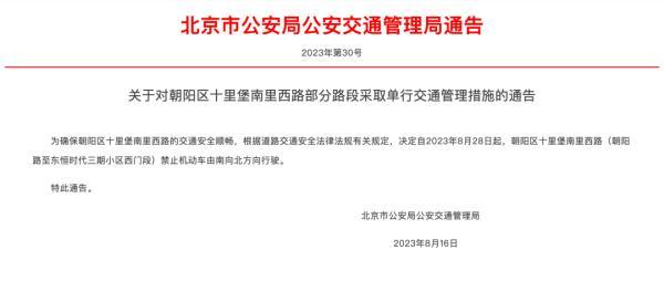 為確保朝陽區十里堡南里西路的交通安全順暢,根據道路交通安全法律法規有關規定,決定自2023年8月28日起,朝陽區十里堡南里西路(朝陽路至東恒時代三期小區西門段)禁止機動車由南向北方向行駛。