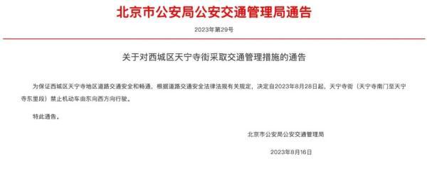 為保證西城區天寧寺地區道路交通安全和暢通,根據道路交通安全法律法規有關規定,決定自2023年8月28日起,天寧寺街(天寧寺南門至天寧寺東里段)禁止機動車由東向西方向行駛。