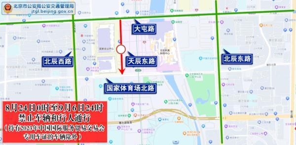 (一)8月24日0時至9月6日24時,天辰東路由大屯路與天辰東路交叉口(不含)至國家體育場北路與天辰東路交叉口(不含)北向南方向,禁止車輛和行人通行。途經車輛和行人可經北辰東路、北辰西路、大屯路繞行。