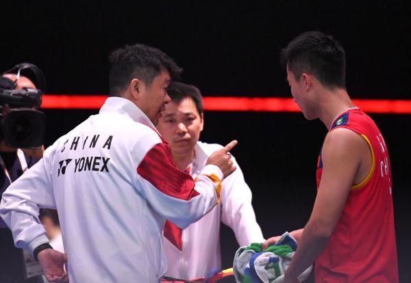 ↑陸光祖(右)在比賽間隙接受教練孫俊(左)指導。