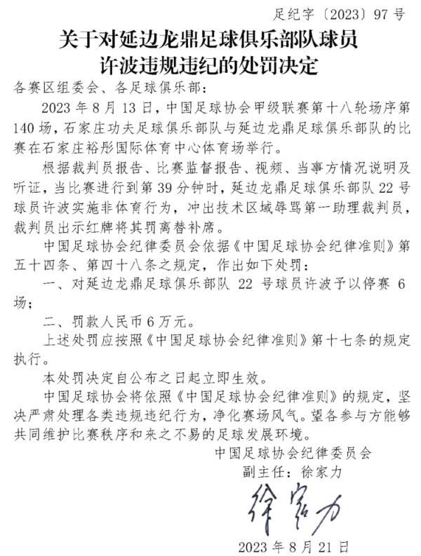 一、對(duì)延邊龍鼎足球俱樂部隊(duì)22號(hào)球員許波予以停賽6場(chǎng);
