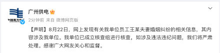 廣州供電:8月22日,網上發現有關我單位員工王某夫妻婚姻糾紛的相關信息,其內容涉及我單位。我單位已成立核查組進行核查,如涉及違法違紀問題,我們將嚴肅處理。感謝廣大網友關心和監督。