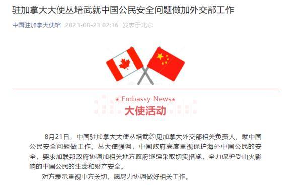 8月21日,中國駐加拿大大使叢培武約見加拿大外交部相關負責人,就中國公民安全問題做工作。叢大使強調,中國政府高度重視保護海外中國公民的安全,要求加聯邦政府協調加相關地方政府繼續采取切實措施,全力保護受山火影響的中國公民的生命和財產安全。