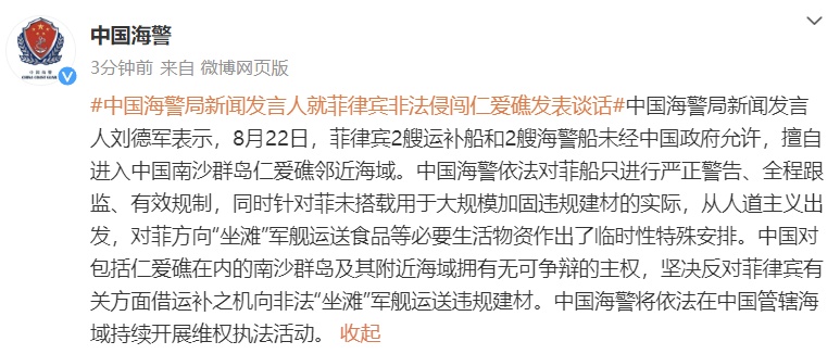 中國海警局新聞發言人劉德軍22日表示,當天,菲律賓2艘運補船和2艘海警船未經中國政府允許,擅自進入中國南沙群島仁愛礁鄰近海域。中國海警依法對菲船只進行嚴正警告、全程跟監、有效規制,同時針對菲未搭載用于大規模加固違規建材的實際,從人道主義出發,對菲方向“坐灘”軍艦運送食品等必要生活物資作出了臨時性特殊安排。劉德軍強調,中國對包括仁愛礁在內的南沙群島及其附近海域擁有無可爭辯的主權,堅決反對菲律賓有關方面借運補之機向非法“坐灘”軍艦運送違規建材。中國海警將依法在中國管轄海域持續開展維權執法活動。