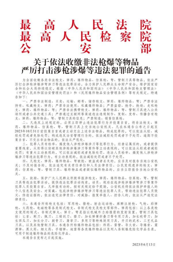 《通告》指出,凡違反上述規定的,必須立即停止違法犯罪行為并投案自首,將非法槍支、彈藥、爆炸物品、仿真槍、弩、管制刀具上交當地公安機關。凡在本通告公布之日起至2023年10月31日前投案自首或者主動交出上述非法物品,構成犯罪的,可以依法從輕、減輕處罰或者免除處罰;構成違反治安管理行為的,依法減輕處罰或者不予處罰。逾期不投案自首、不交出非法物品的,依法從嚴懲處。