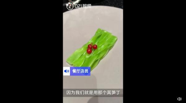 近日,有網(wǎng)友發(fā)帖稱在上海外灘一餐廳就餐時(shí)點(diǎn)了一道涼菜:椒麻鮮青筍。