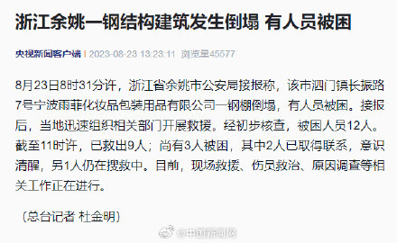 8月23日8時31分許,浙江省余姚市公安局接報稱,該市泗門鎮(zhèn)長振路7號寧波雨菲化妝品包裝用品有限公司一鋼棚倒塌,有人員被困。接報后,當(dāng)?shù)匮杆俳M織相關(guān)部門開展救援。經(jīng)初步核查,被困人員12人。截至11時許,已救出9人;尚有3人被困,其中2人已取得聯(lián)系,意識清醒,另1人仍在搜救中。目前,現(xiàn)場救援、傷員救治、原因調(diào)查等相關(guān)工作正在進(jìn)行。(央視新聞客戶端)