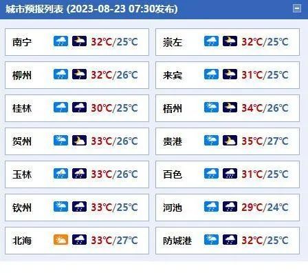 南寧市:今天白天中雨,今天晚上多云有陣雨或雷雨,偏南風1~2級,最高氣溫32℃,最低氣溫25℃。