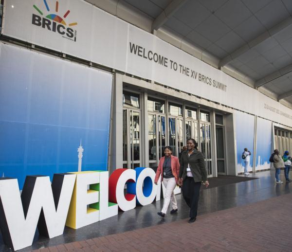8月20日,在南非約翰內(nèi)斯堡,行人走過金磚國家領(lǐng)導(dǎo)人第十五次會晤舉辦場所桑頓會展中心。(新華社記者張譽東攝)