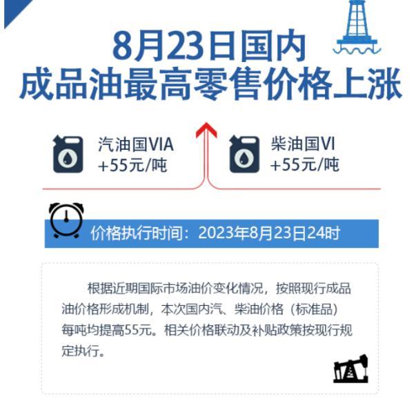 據國家發展改革委消息,根據近期國際市場油價變化情況,按照現行成品油價格形成機制,自2023年8月23日24時起,國內汽、柴油價格(標準品,下同)每噸均提高55元。調整后,各省(區、市)和中心城市汽、柴油最高零售價格見附表。相關價格聯動及補貼政策按現行規定執行。