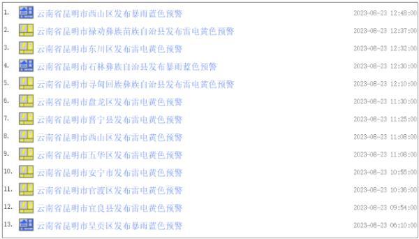 昆明天氣網的預警信息顯示:截至23日12時48分,昆明已發布13條暴雨、雷電預警。
