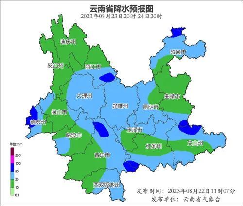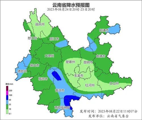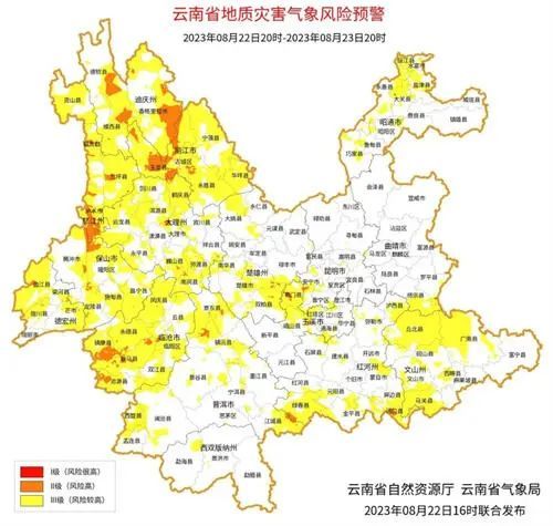 預計8月22日20:00~8月23日20:00,昆明市安寧市,玉溪市紅塔區、易門縣,昭通市大關縣,麗江市古城區、玉龍縣、永勝縣,迪慶州香格里拉市、德欽縣、維西縣,怒江州瀘水市、福貢縣、蘭坪縣,大理州大理市、鶴慶縣、云龍縣、祥云縣、巍山縣、南澗縣,楚雄州楚雄市、祿豐市、雙柏縣,保山市隆陽區、騰沖市、龍陵縣、昌寧縣,德宏州芒市、盈江縣、梁河縣、隴川縣,臨滄市臨翔區、永德縣、鎮康縣、耿馬縣、滄源縣,普洱市景東縣、鎮沅縣、江城縣,紅河州綠春縣、河口縣發生滑坡泥石流的風險高;