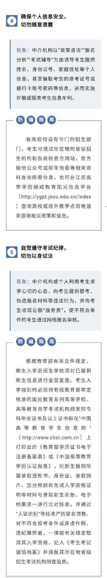 近日,江蘇高校學歷繼續教育招生(以下簡稱“成人高考”)進入報考期,而此時也是成人高考報名類詐騙高發期,一起看以下“防騙指南”,提醒考生增強防范意識,避免上當受騙。