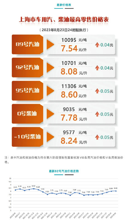 @上海發展改革剛剛發布本市油價調整的通知:8月24日零時起,92號汽油將上調為8.08元/升,95號汽油上調為8.60元/升,0號柴油上調為7.78元/升。正在下班路上的小伙伴們,要不要順道加個油?按一般家用汽車油箱50L容量估測,加滿一箱92號汽油將多花費約2元。注:98號汽油為企業自主定價。