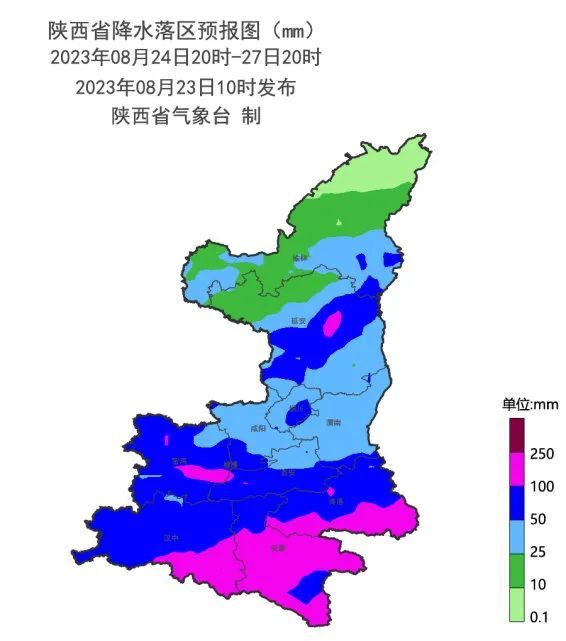 預計25-27日將有3個暴雨日,累計降水量:陜北北部10~25毫米,局地40~60毫米,陜北南部、關中25~60毫米、局地60~100毫米,陜南60~150毫米,其中陜南南部150~200毫米,局地可達250毫米以上。