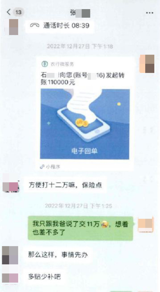 12月,石女士突然想到,自己父親在老家河南社保繳費斷過,這會影響父親退休金的發放,正常渠道是辦不了的。她再次找到張某某,詢問能否幫父親續交社保,張某某表示:“我辦社保這么多年,也有些人脈,正好認識你們當地的領導,能辦!你放心!”兩人談好8萬元用于續交父親社保,3萬元作為好處費,于是石女士又轉了11萬元給張某某。