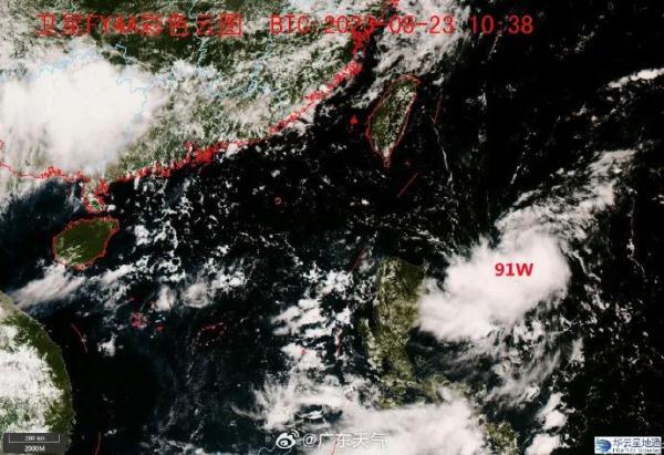 據廣東天氣官方微博消息,昨天(8月23日)上午,從衛星云圖可見,菲律賓東部洋面較近的有熱帶擾動91W,未來可能會發展為臺風。衛星云圖可見,91W雖然體型非常小,但環流清晰精致,已經有對流云團爆發。加上它所處位置的海溫非常高,能量非常充足,因此有可能加強為9號臺風蘇拉。