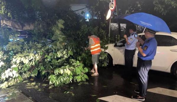 8月23日23時許,黃埔區(qū)發(fā)布雷雨大風(fēng)黃色預(yù)警和部分鎮(zhèn)街暴雨黃色預(yù)警。24日1時20分許,受暴雨大風(fēng)影響,中山大道轉(zhuǎn)蟹山路口10米左右處,有一棵大葉榕被大風(fēng)刮倒,騎壓在兩臺私家車上,導(dǎo)致該路段交通中斷。