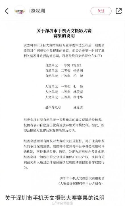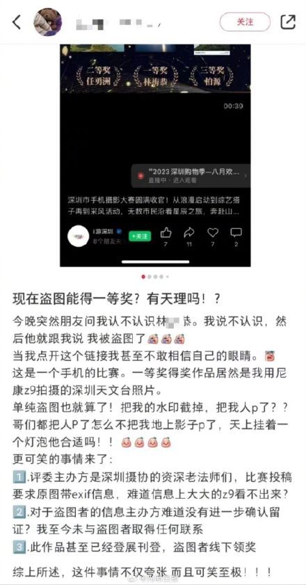近日,網友胡先生發帖吐槽,稱自己用相機拍攝的深圳天文臺照片被不明身份者盜圖,將畫面中的自己P掉后參加了深圳某手機攝影大賽,最終還拿到了一等獎。胡先生向該攝影比賽主辦方提出抗議,并要求對方賠償。目前,主辦方已經取消了盜圖者的一等獎,但雙方尚未就賠償細節達成一致。