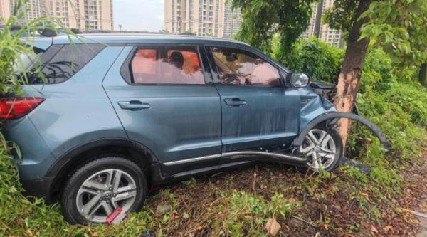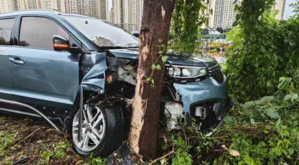 8月10日13時(shí)許,中山五桂山交警指揮中心接警稱桂南林新路某路段發(fā)生一起交通事故,請求處警。民警接報(bào)后立即趕赴現(xiàn)場,只見一輛藍(lán)色小車撞上道路旁的大樹,造成車輛嚴(yán)重受損,大樹樹皮剝落。