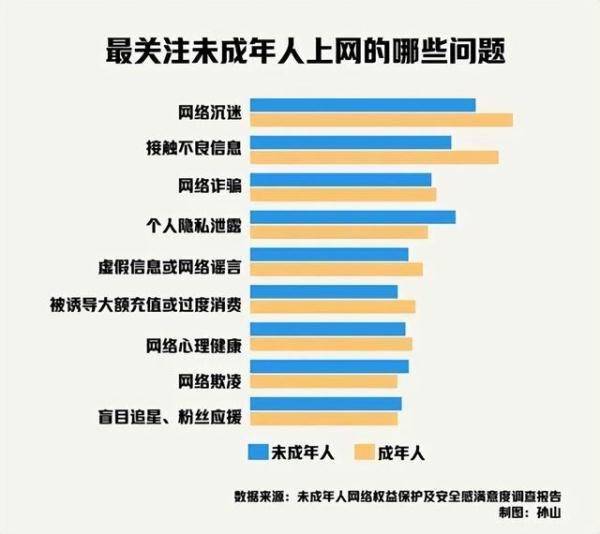 比較發現,在“個人隱私泄露”“網絡欺凌”“盲目追星,粉絲應援”問題上,未成年人關注的比例超過成年人。