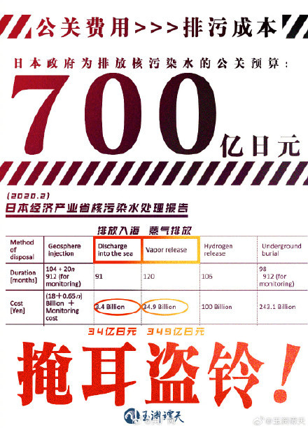 根據日本經濟產業省2020年2月發布的核污染水處理報告,這筆“公關預算”幾乎是核污染水排海預算的20倍,蒸汽排放預算的2倍,日本政府寧愿花錢公關,也不愿采用危害更小的核污染水處理方案。