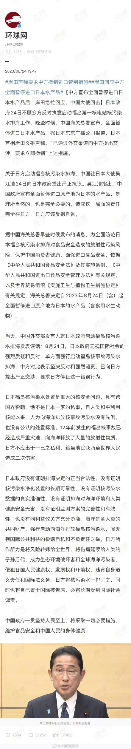 據@環球網:日本政府24日不顧多方反對執意啟動福島第一核電站核污染水排海工作,晚些時候,中國海關總署宣布,全面暫停進口日本水產品。據日本東京廣播公司報道,日本首相岸田文雄聲稱,“已通過外交渠道向中方提出交涉,要求立即撤銷”上述措施。