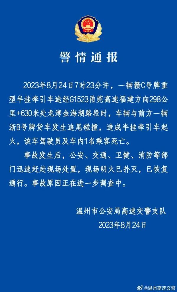 據溫州市公安局高速公路交通警察支隊官方微博消息,2023年8月24日7時23分許,一輛贛C號牌重型半掛牽引車途徑G1523甬莞高速福建方向298公里+630米處龍灣金海湖路段時,車輛與前方一輛浙B號牌貨車發生追尾碰撞,造成半掛牽引車起火,該車駕駛員及車內1名乘客死亡。