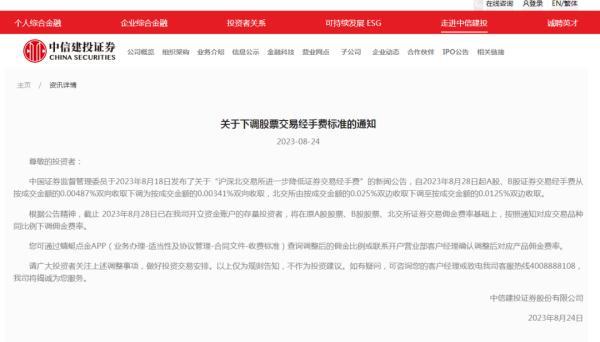 中信建投證券發布《關于下調股票交易經手費標準的通知》,自2023年8月28日起A股、B股證券交易經手費從按成交金額的0.00487%雙向收取下調為按成交金額的0.00341%雙向收取,北交所由按成交金額的0.025%雙邊收取下調至按成交金額的0.0125%雙邊收取。