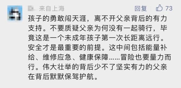 這個暑假,除了上海男孩吳宇涵之外,還有不少騎行在路上的孩子:浙江12歲男孩朱俊宇和媽媽于海燕從金華出發,沿著京杭大運河一路騎行到北京,歷時22天,行程2000多公里;山東省實驗中學畢業生孫鼎銘從濟南騎行出發,經過山東、河南、湖北和湖南4省,歷經1476.4公里,抵達國防科技大學報到……