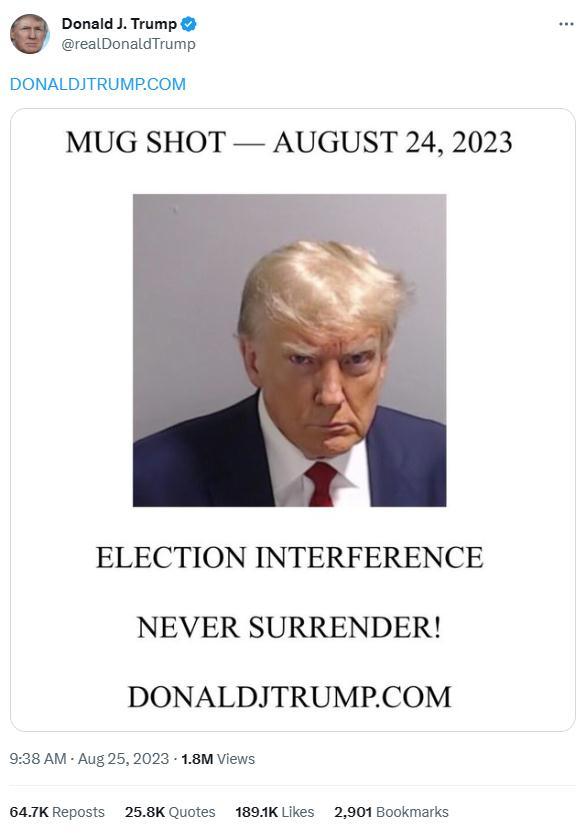 CNN稱,這篇帖子中附上了特朗普在監(jiān)獄中拍攝的嫌犯照片,在這張照片的下方,寫著“干預(yù)選舉”與“永不投降!”。