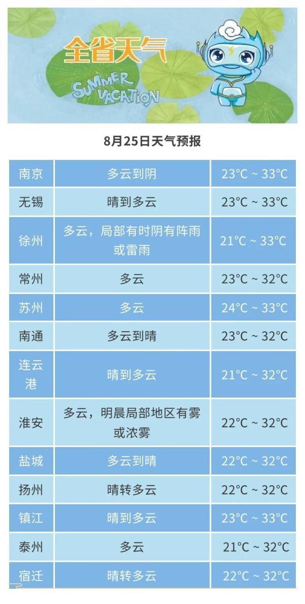 江蘇西北部地區(qū)多云轉(zhuǎn)陰有陣雨或雷雨,其他地區(qū)多云。最高溫度:江蘇西北部地區(qū)32℃左右,其他地區(qū)30~31℃;最低溫度:江蘇西北部地區(qū)24~25℃,其他地區(qū)22~23℃。全省偏東風(fēng)4-5級(jí)。