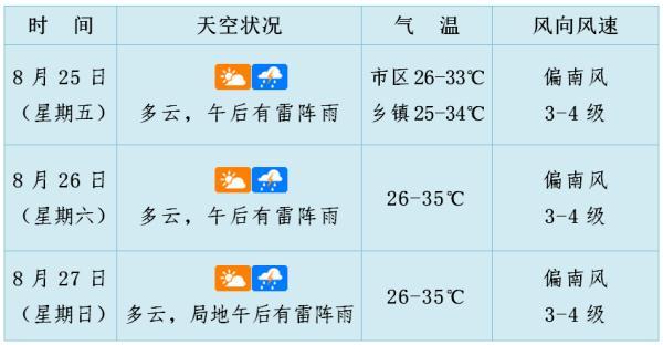 8月25日05時到28日08時:多云有雷陣雨,偏南風5級,雷雨時陣風7-8級。