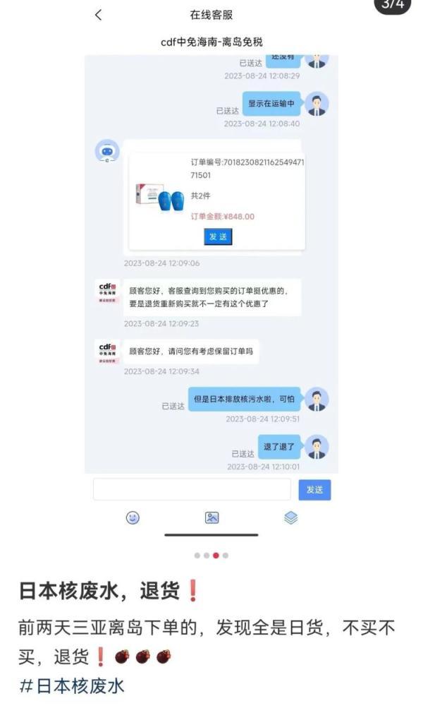 雖然日妝品牌紛紛“自證清白”,但記者注意到,在社交平臺上,已有消費者將購買的日本化妝品退貨。一位消費者就表示,前兩日在三亞離島免稅店下單了化妝品,發現全是日貨,果斷退貨。