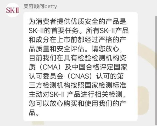 如,SK-II品牌客服表示,所有SK-II產品和成分在上市前都經過嚴格的產品質量和安全評估。“目前我們在具有檢驗檢測機構資質(CMA)及中國合格評定國家認可委員會(CNAS)認可的第三方檢測機構,按照國家檢測標準主動對SK-II產品進行了相關檢測,可以放心購買和使用我們的產品。”