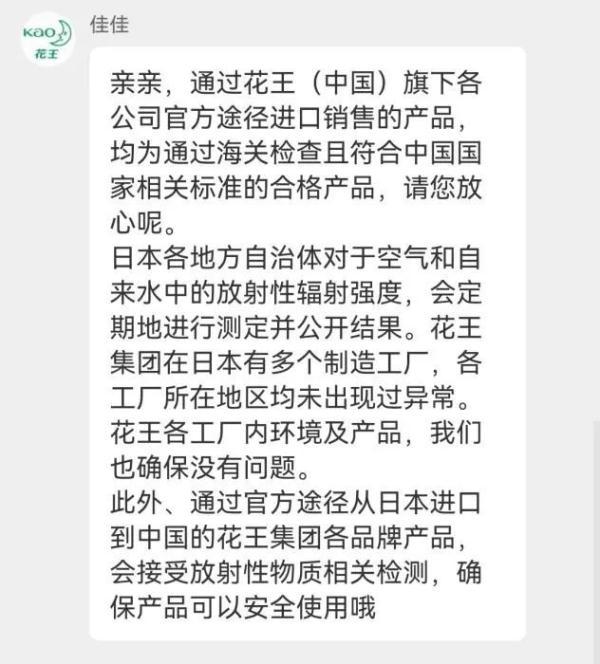 花王客服還強調,“通過官方途徑從日本進口到中國的花王集團各品牌產品,會接受放射性物質相關檢測,確保產品可以安全使用。”