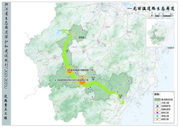 依托其空間及走勢,規劃龍麗溫道路生態廊道建設以提升廊道連通性,充分發揮生態屏障作用為主要功能,建設主要涉及杭州建德,溫州永嘉,衢州龍游,麗水蓮都、青田、遂昌、松陽等縣(市、區)。