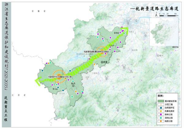 規劃杭新景道路生態廊道主要發揮景觀及生態防護的功能,充分挖掘杭新景沿線的自然景觀優勢,主要涉及杭州富陽、桐廬、建德,衢州柯城、衢江、常山、開化等7個縣(市、區)。