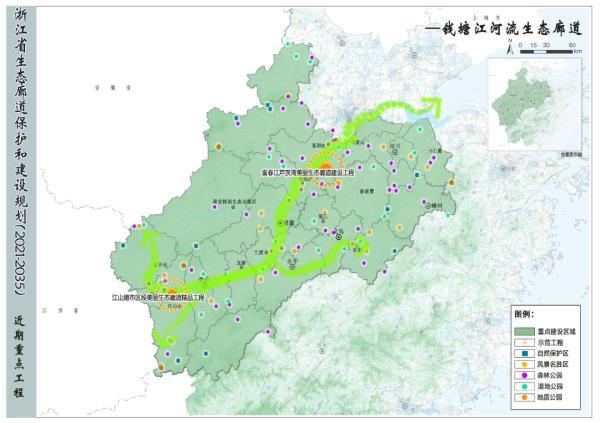 規劃錢塘江河流生態廊道以發揮生態防護、多樣性保護、景觀休閑等綜合性功能為主,建設主要涉及杭州錢塘、蕭山、富陽、臨安、桐廬、建德,湖州安吉,紹興柯橋、上虞、諸暨、嵊州,金華婺城、金東、蘭溪、東陽、義烏、浦江,衢州柯城、衢江、龍游、江山、常山、開化,麗水遂昌等縣(市、區),含淳安特別生態功能區。