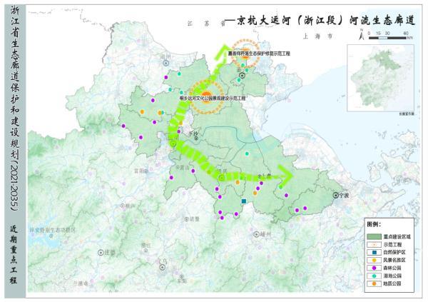 規劃京杭大運河(浙江段)河流生態廊道以充分挖掘歷史文化、提升沿線景觀風貌為主要功能,建設主要涉及杭州上城、拱墅、濱江、蕭山、余杭,寧波海曙、江北、余姚,湖州南潯、德清,嘉興南湖、嘉善、秀洲、海寧、桐鄉,紹興越城、柯橋、上虞等縣(市、區)。