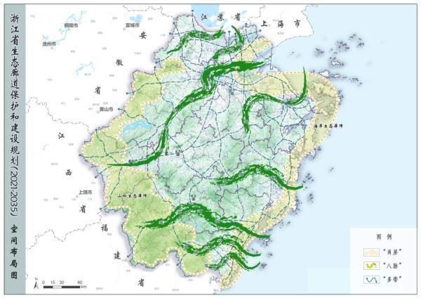 建設范圍上依托全省交通干線、八大水系流域、浙東沿海岸線和具有重要生態保護價值的山嶺,提出了道路、河流、海岸、山嶺四種生態廊道類型。