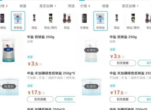 另外,多個(gè)生鮮電商平臺上,低鈉鹽、無碘鹽顯示“缺貨”“補(bǔ)貨中”。一位消費(fèi)者表示:“一款低鈉鹽一分鐘前看還有貨,再一滑就顯示缺貨了。”