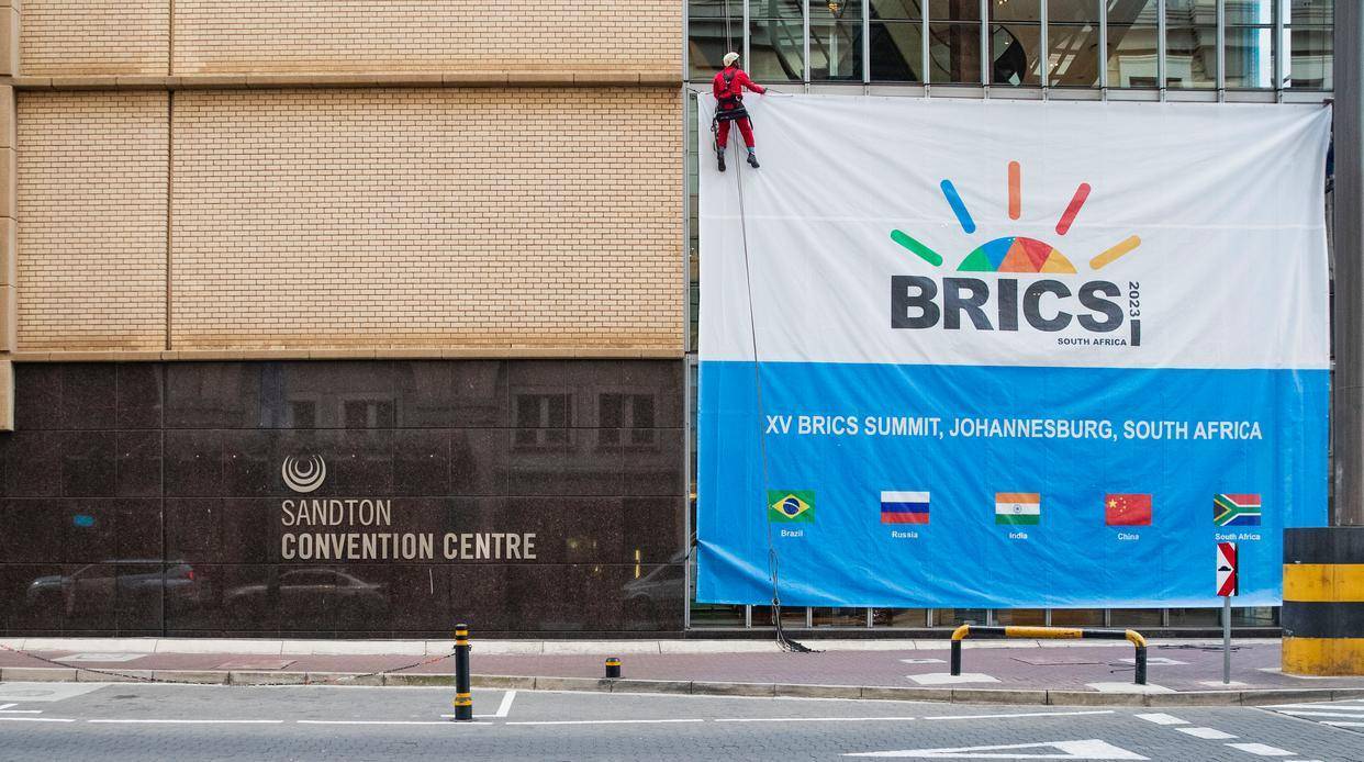 2023年8月17日,在南非約翰內(nèi)斯堡,工人在桑頓會(huì)展中心外布置金磚峰會(huì)橫幅。