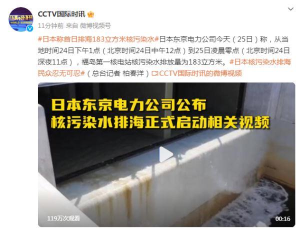 日本東京電力公司今天(25日)稱,從當地時間24日下午1點(北京時間24日中午12點)到25日凌晨零點(北京時間24日深夜11點),福島第一核電站核污染水排放量為183立方米。(總臺記者柏春洋)