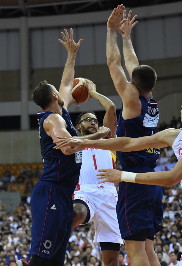 8月20日,中國隊球員李凱爾(中)在比賽中進攻。當日,在廣東深圳舉行的國際團結杯籃球賽上,中國隊以64:87不敵塞爾維亞隊。新華社記者毛思倩 攝
