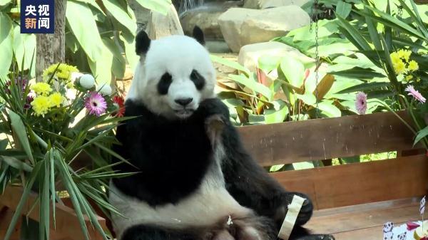 隨著飼養員將生日蛋糕和鮮花擺在活動區內,大熊貓憨態可掬地亮相在觀眾面前,人們紛紛拍照留念,為旅馬大熊貓和馬中友誼獻上祝福。