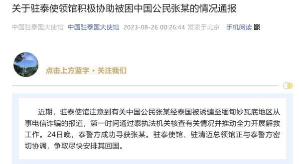8月26日,中國駐泰國大使館發布通報:近期,駐泰使館注意到有關中國公民張某經泰國被誘騙至緬甸妙瓦底地區從事電信詐騙的報道,第一時間通過泰執法機關核查有關情況并推動全力開展解救工作。24日晚,泰警方成功尋獲張某。駐泰使館、駐清邁總領館正與泰警方密切協調,爭取盡快安排其回國。