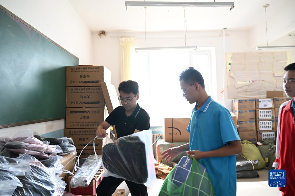 8月25日,吉林省舒蘭市第二十八中學教師為受災學生發放學習用品。