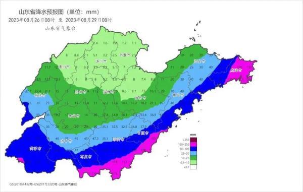 山東省氣象臺于8月26日09時30分發布暴雨藍色和海上大風黃色、內陸大風藍色預警:受氣旋影響,26日-29日白天,山東自西向東將有一次明顯降雨天氣過程,全省累積平均降水量30~50毫米。其中,菏澤、濟寧、棗莊、臨沂、日照、濰坊南部、青島南部、煙臺南部和威海40~70毫米局部100~150毫米,聊城、德州、濟南、泰安、淄博、濰坊北部和煙臺北部10~30毫米局部50~80毫米,濱州和東營5~10毫米局部20~30毫米。強降雨時段集中在27日白天—28日白天,最大小時降水量20~40毫米,局部伴有雷電和7~9級雷雨陣風。